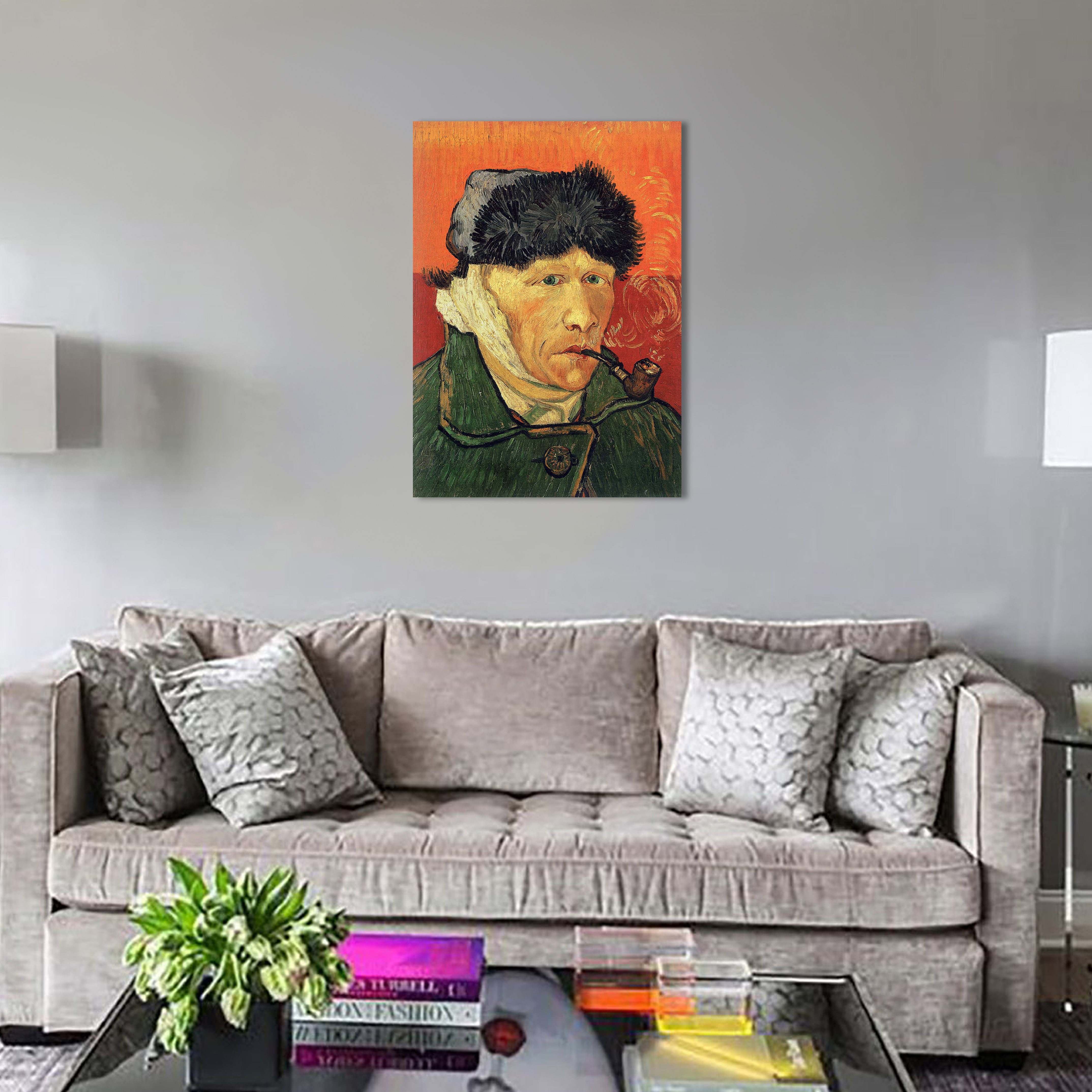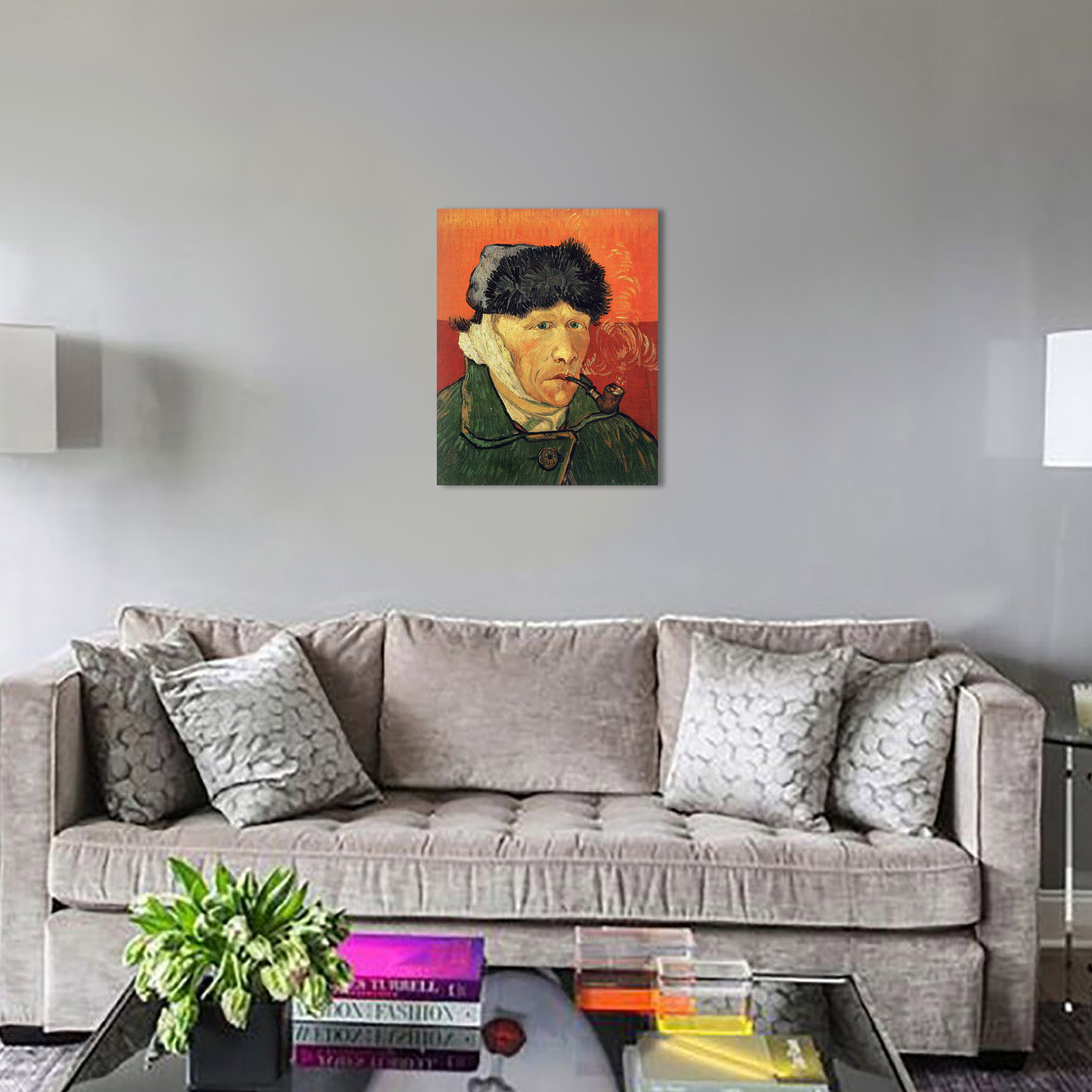 Картина создаёт впечатление смирения и успокоения. На картине у художника искажены черты лица, взгляд потерянный, направленный вдаль. Ван Гогу во время написания картины было только 35 лет, но выглядит он на ней пятидесятилетним. Фон картины — двухцветная стена в красно-оранжевых оттенках. На картине перевязано правое ухо, но это зеркальное изображение. На самом деле Ван Гог порезал себе левое ухо.