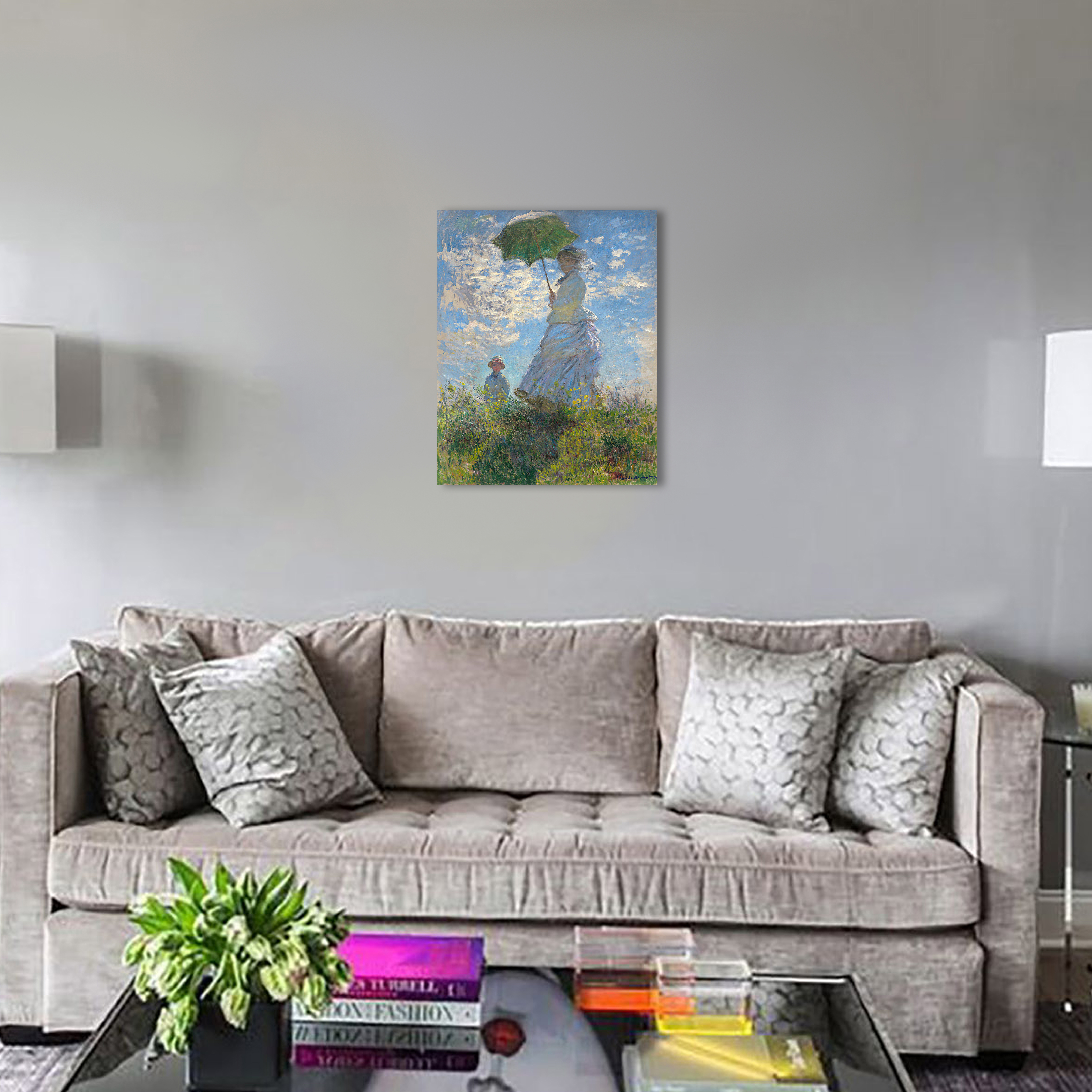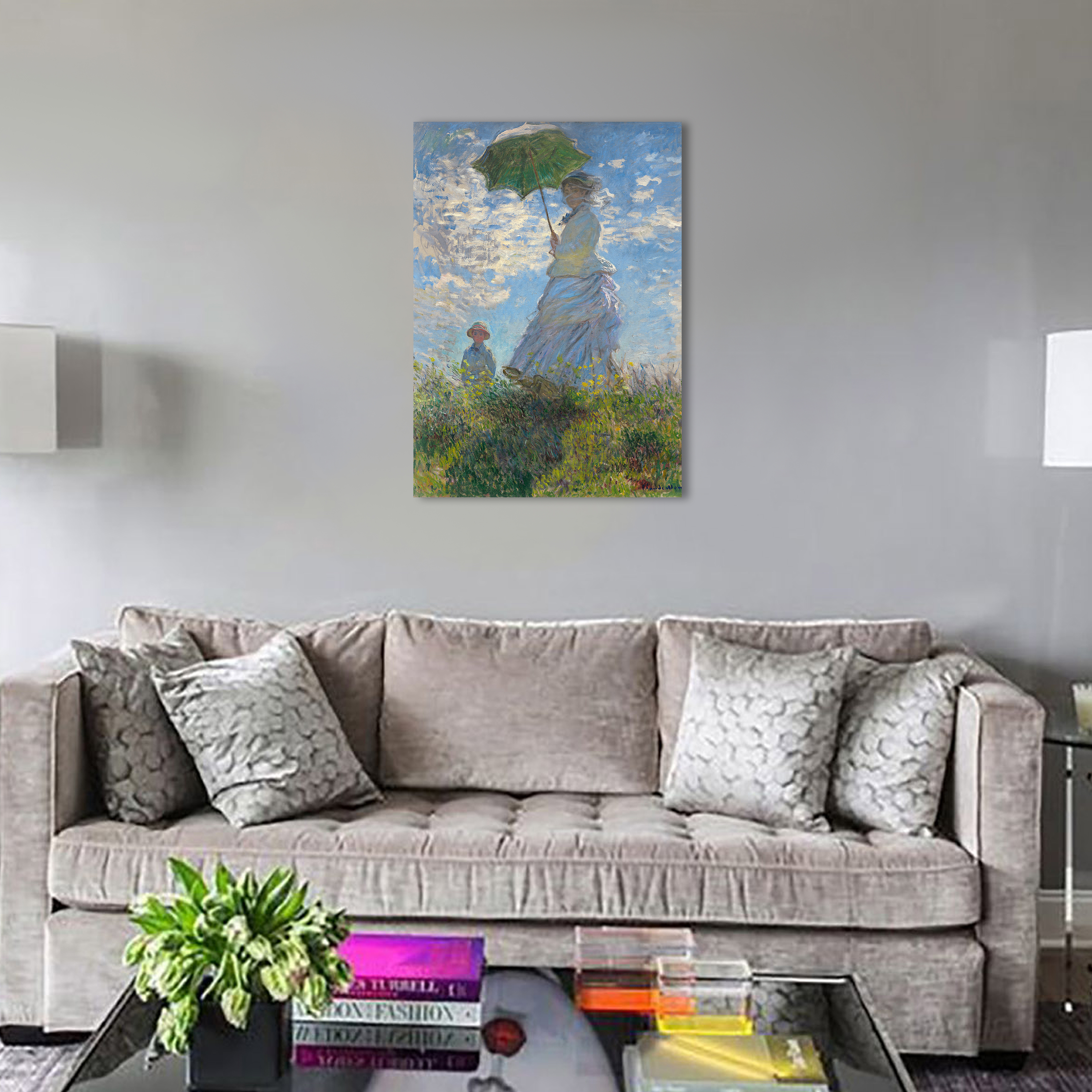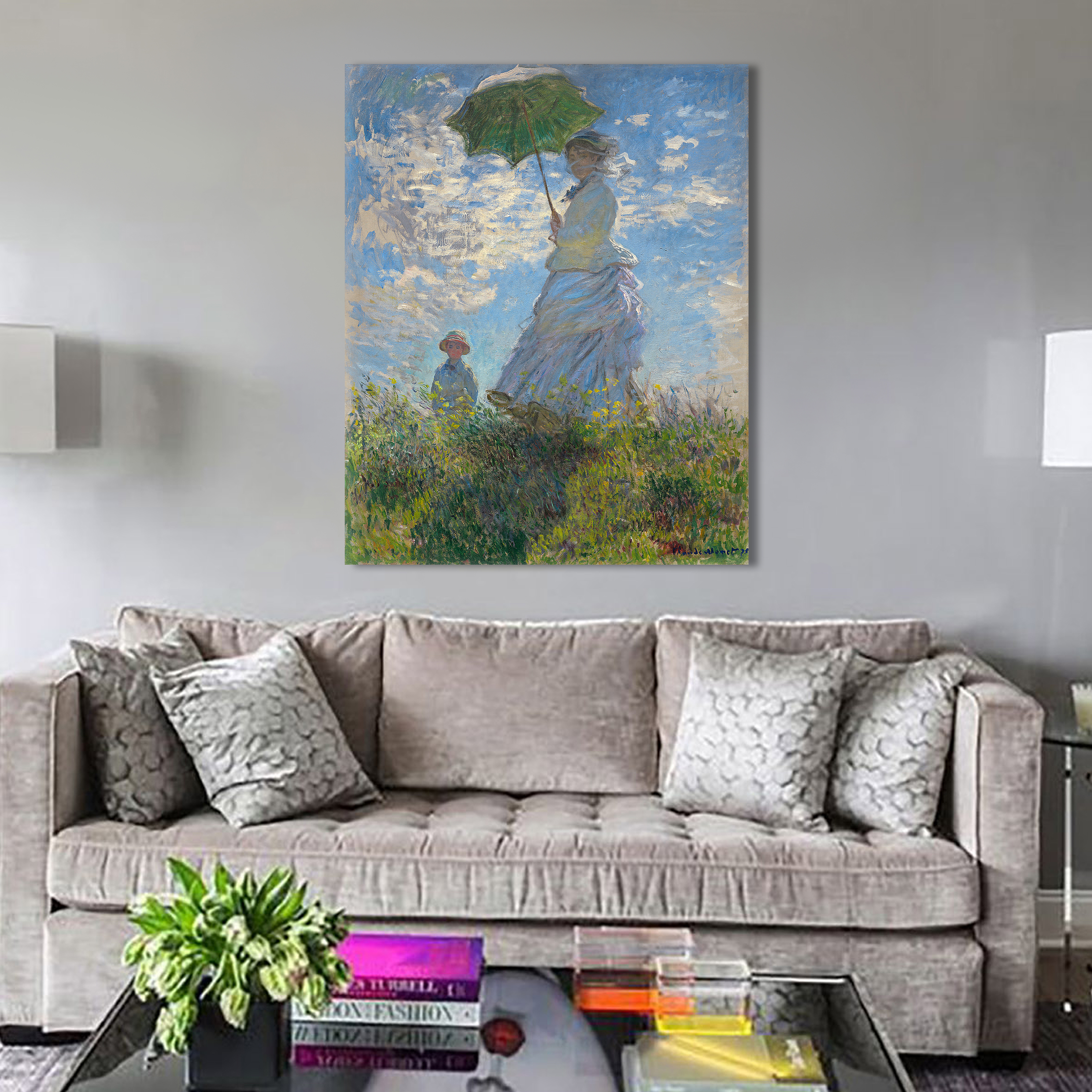 На картине изображена супруга художника Камилла с их сыном Жаном в один из ветреных летних дней периода 1871—1877 годов, когда семейство Моне проживало в Аржантёе. Мадам Моне в развевающемся на ветру белом платье и шляпе с вуалью изображена с нижнего ракурса в перспективе восходящей прямой линии на фоне облаков в лазурном небе.