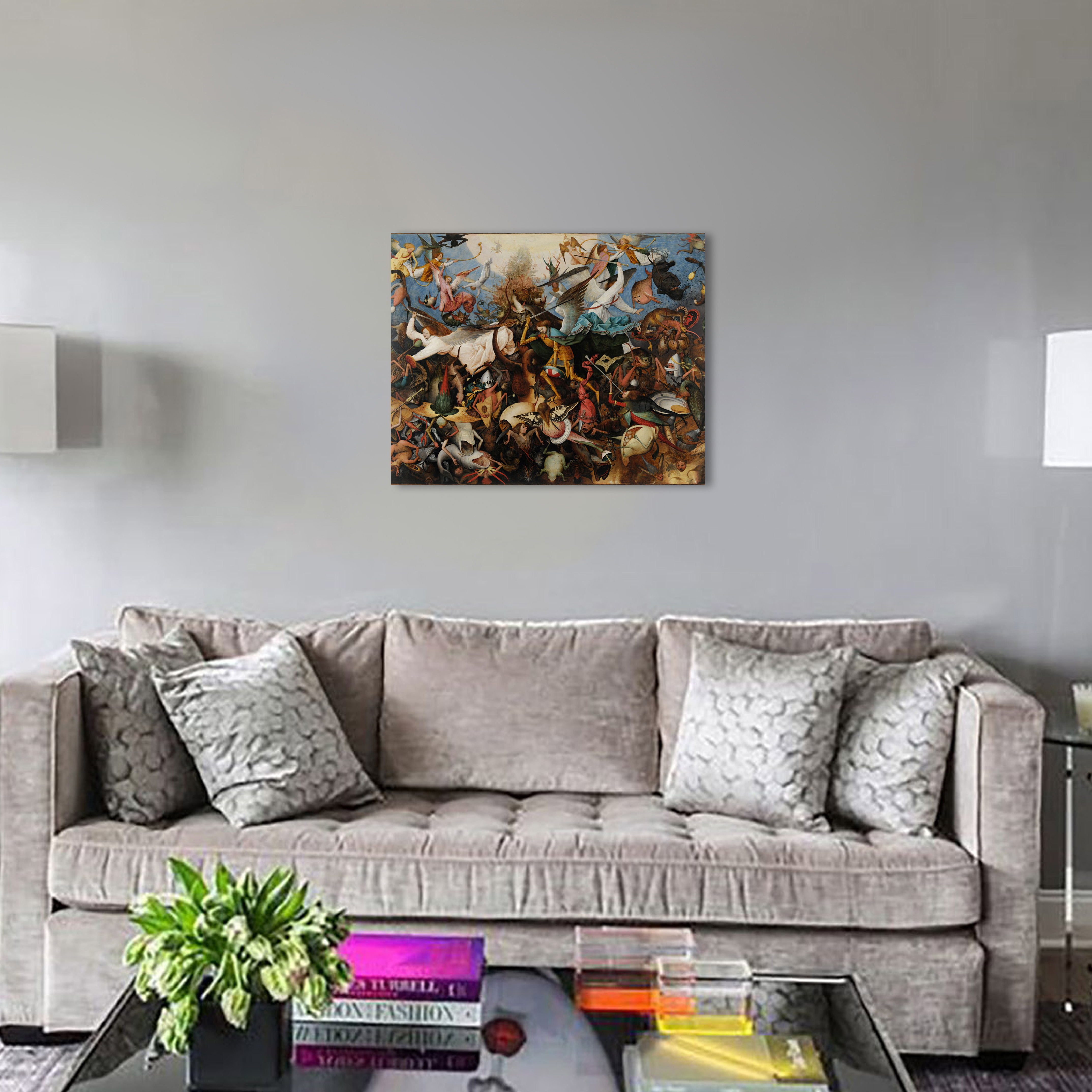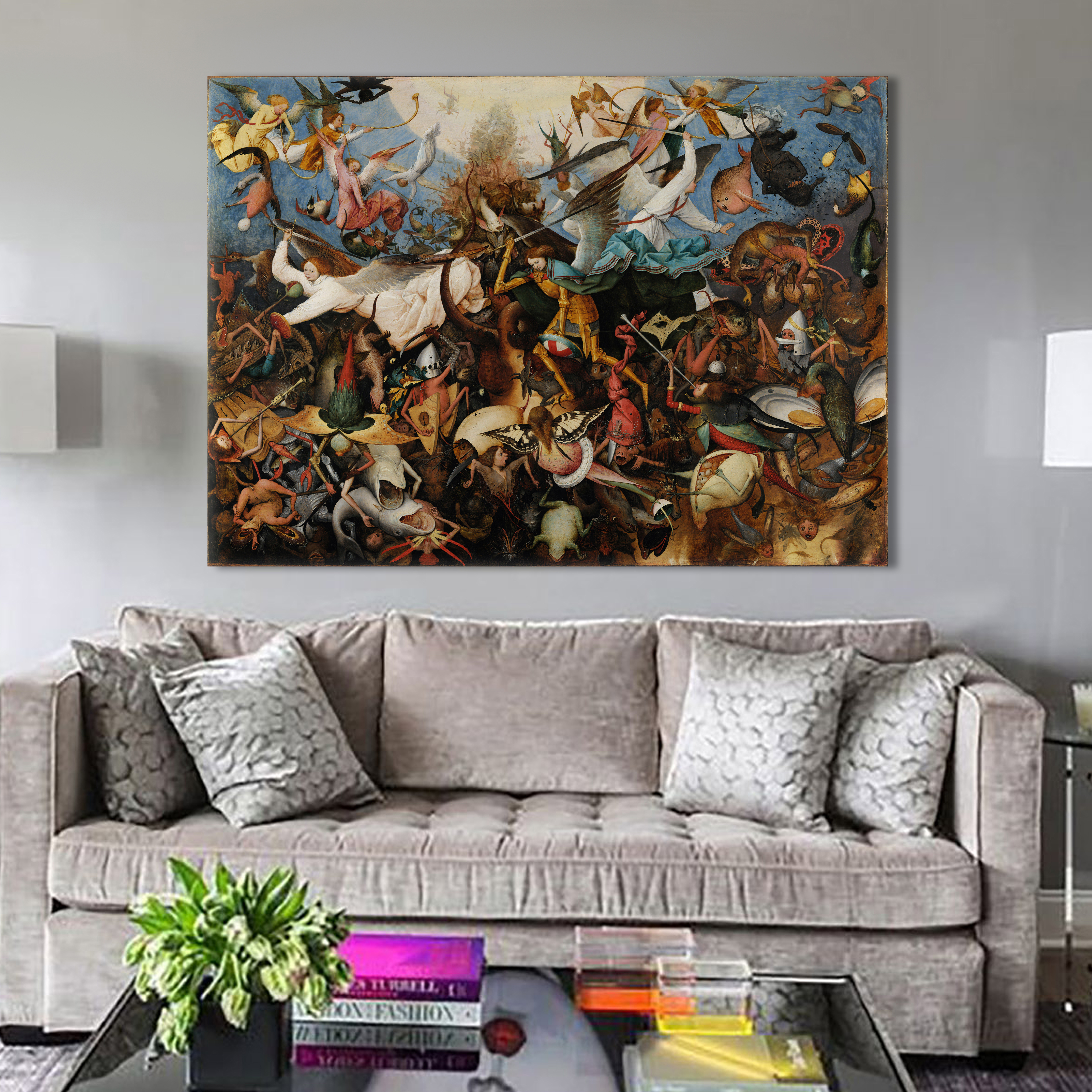 На картине изображена сцена падения ангелов. Восставшие против Бога ангелы падают вниз, в ад. При этом небеса изображены в виде белого круга вверху посередине картины. Фигуры в нижней части картины обнажены, превращены в уродливых монстров с животными частями тел. Ад более плотен, хаотичен, тёмен, чем верхняя часть полотна.