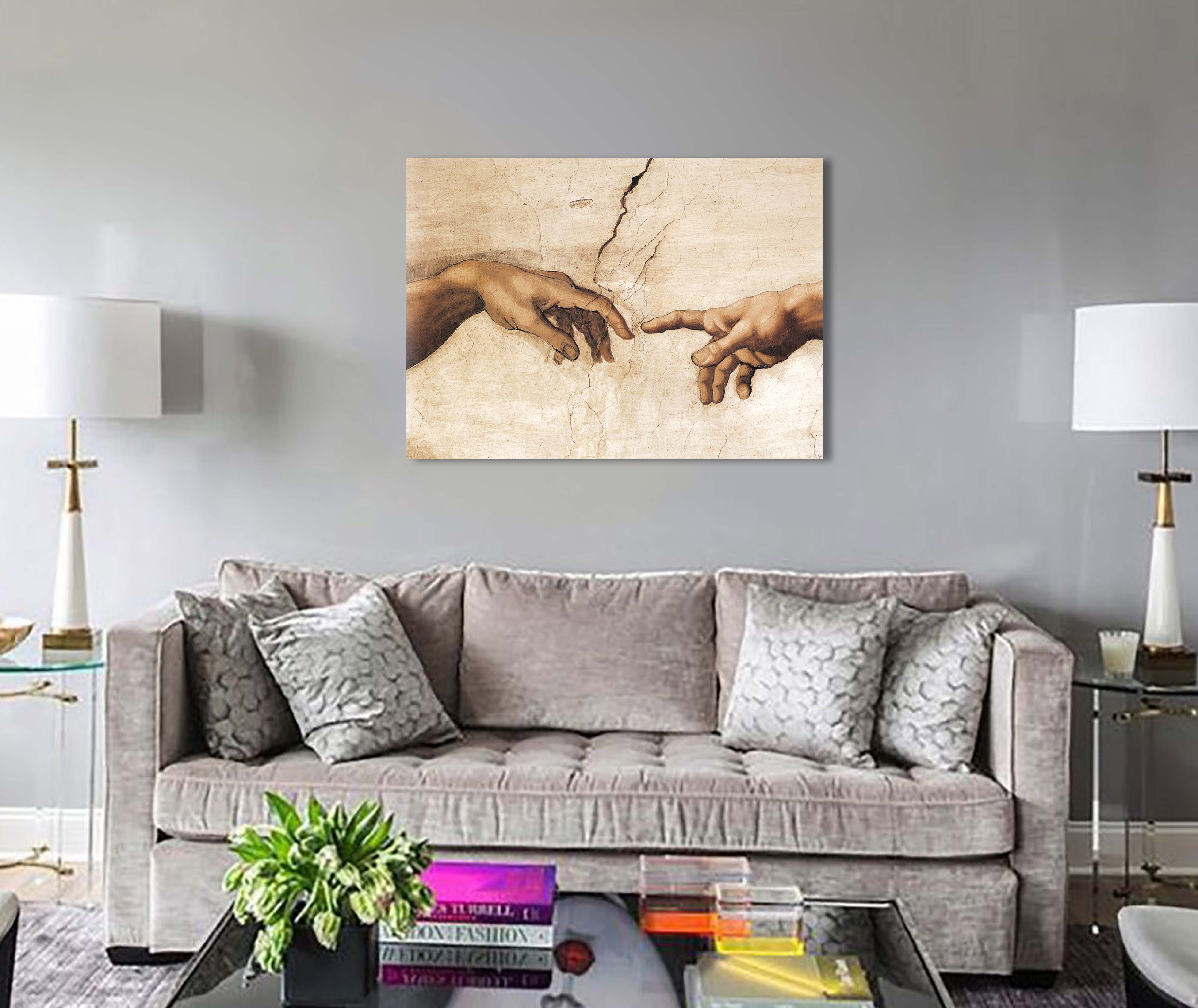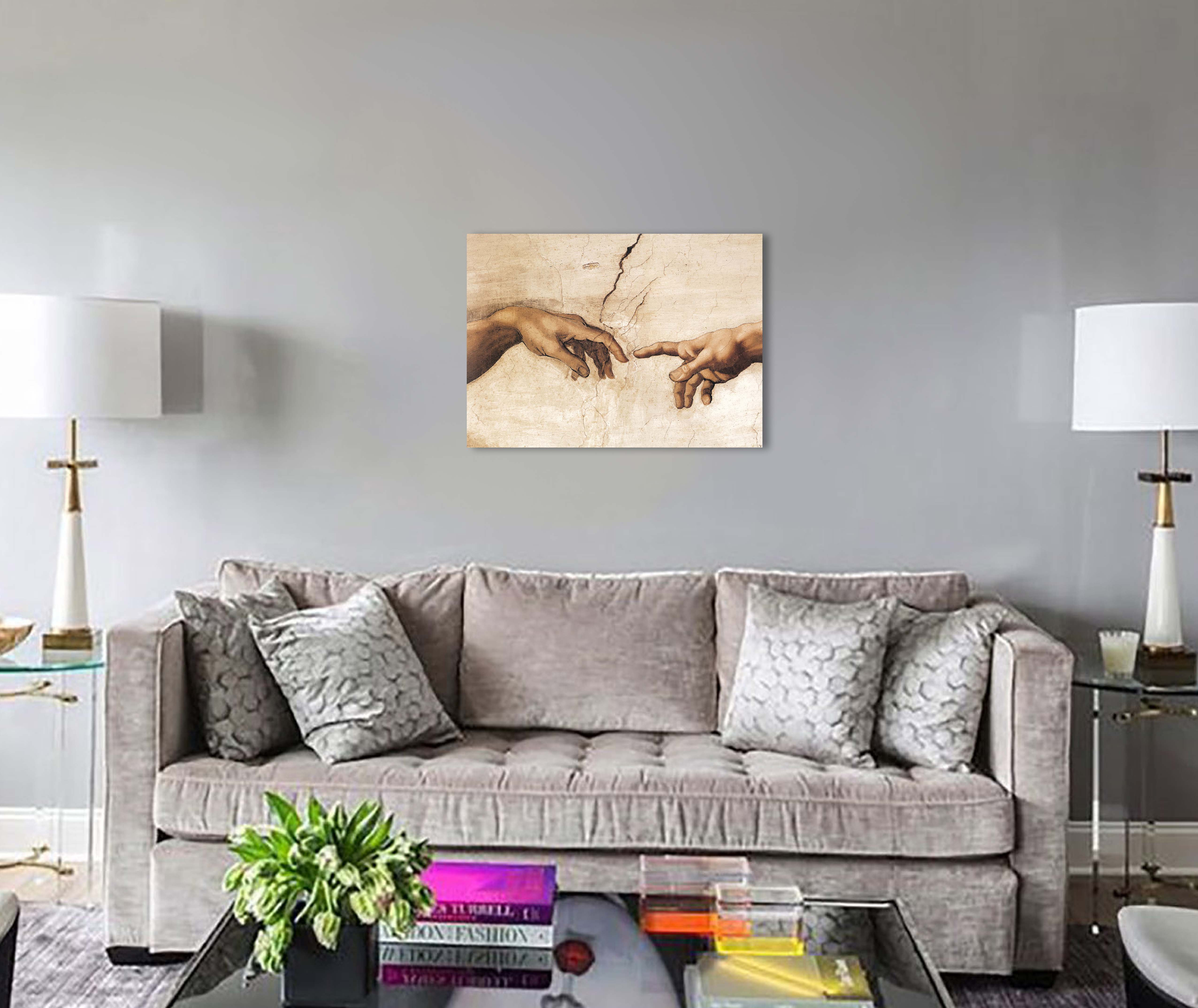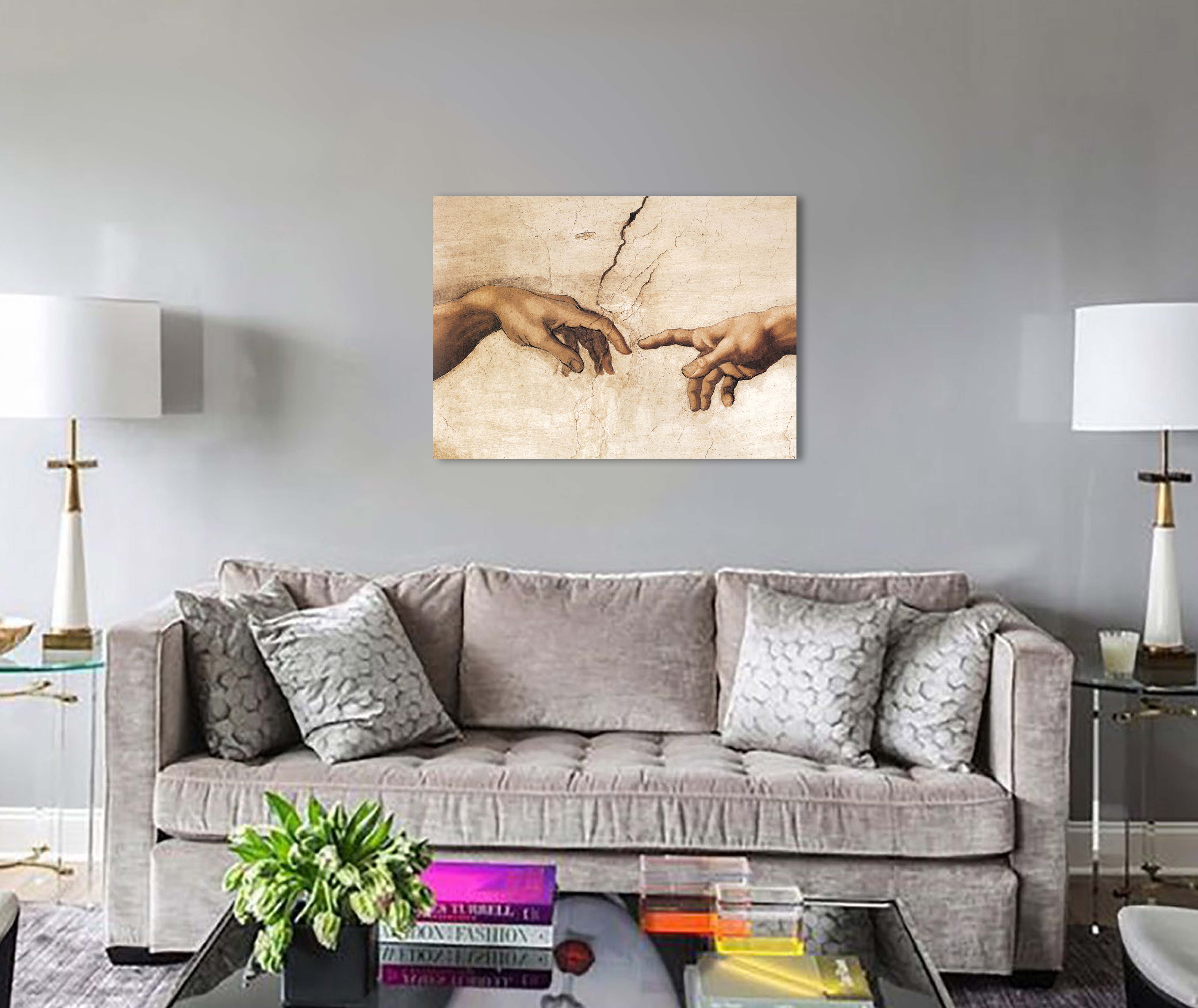 «Сотворение Адама» — одна из самых выдающихся композиций росписи Сикстинской капеллы. Правая рука вытянута навстречу руке Адама и почти касается её. Вся композиция сконцентрирована на жесте двух рук. Рука Бога даёт импульс, а рука Адама принимает его, давая всему телу жизненную энергию. Фактически, перед нами предстаёт не само сотворение человека, а момент, в который тот получает душу, страстное искание божественного, жажду познания.