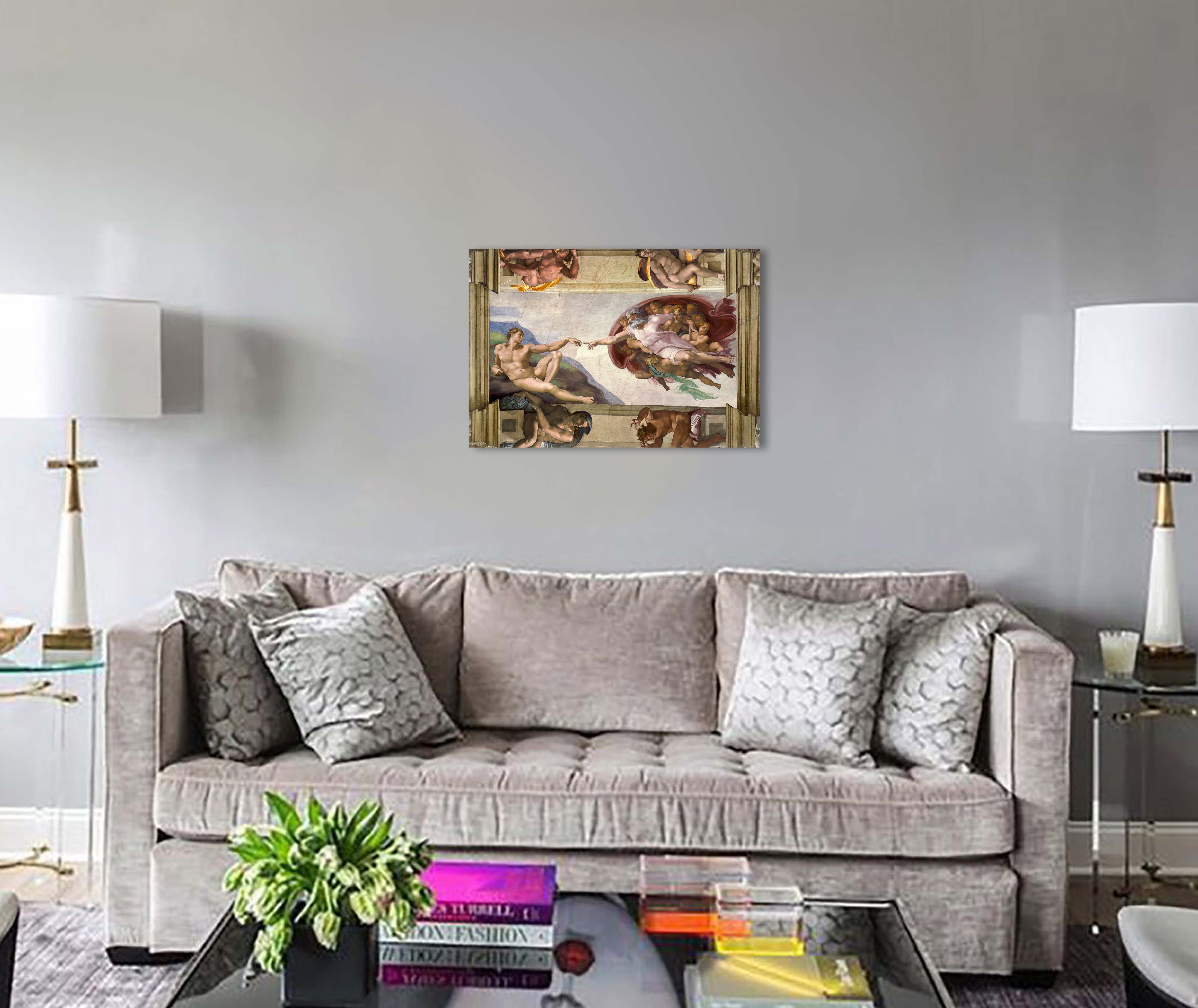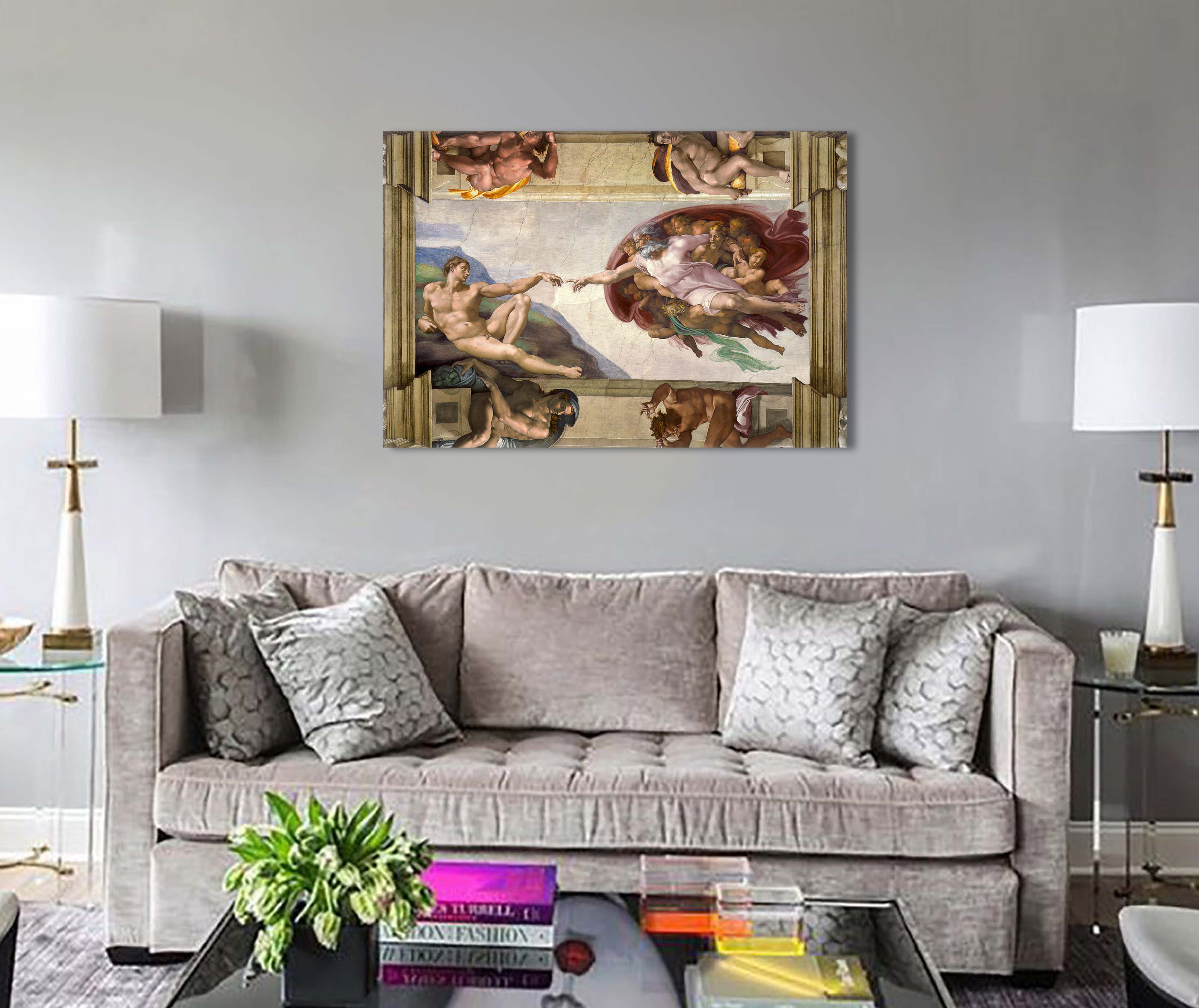 «Сотворение Адама» — одна из самых выдающихся композиций росписи Сикстинской капеллы. В бесконечном пространстве летит Бог-Отец, окружённый бескрылыми ангелами, с реющей белой туникой. Правая рука вытянута навстречу руке Адама и почти касается её. Лежащее на зелёной скале тело Адама постепенно приходит в движение, пробуждается к жизни.