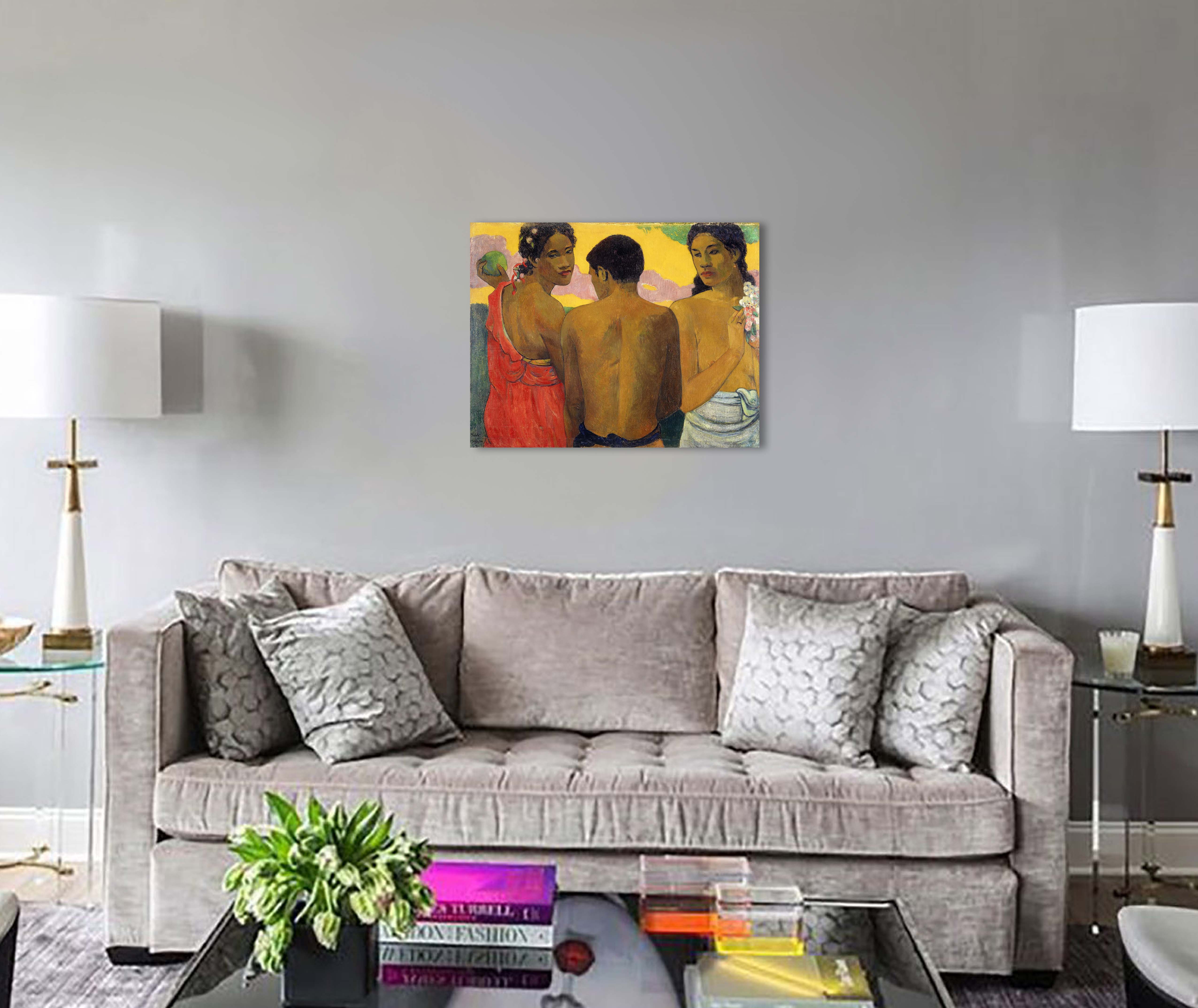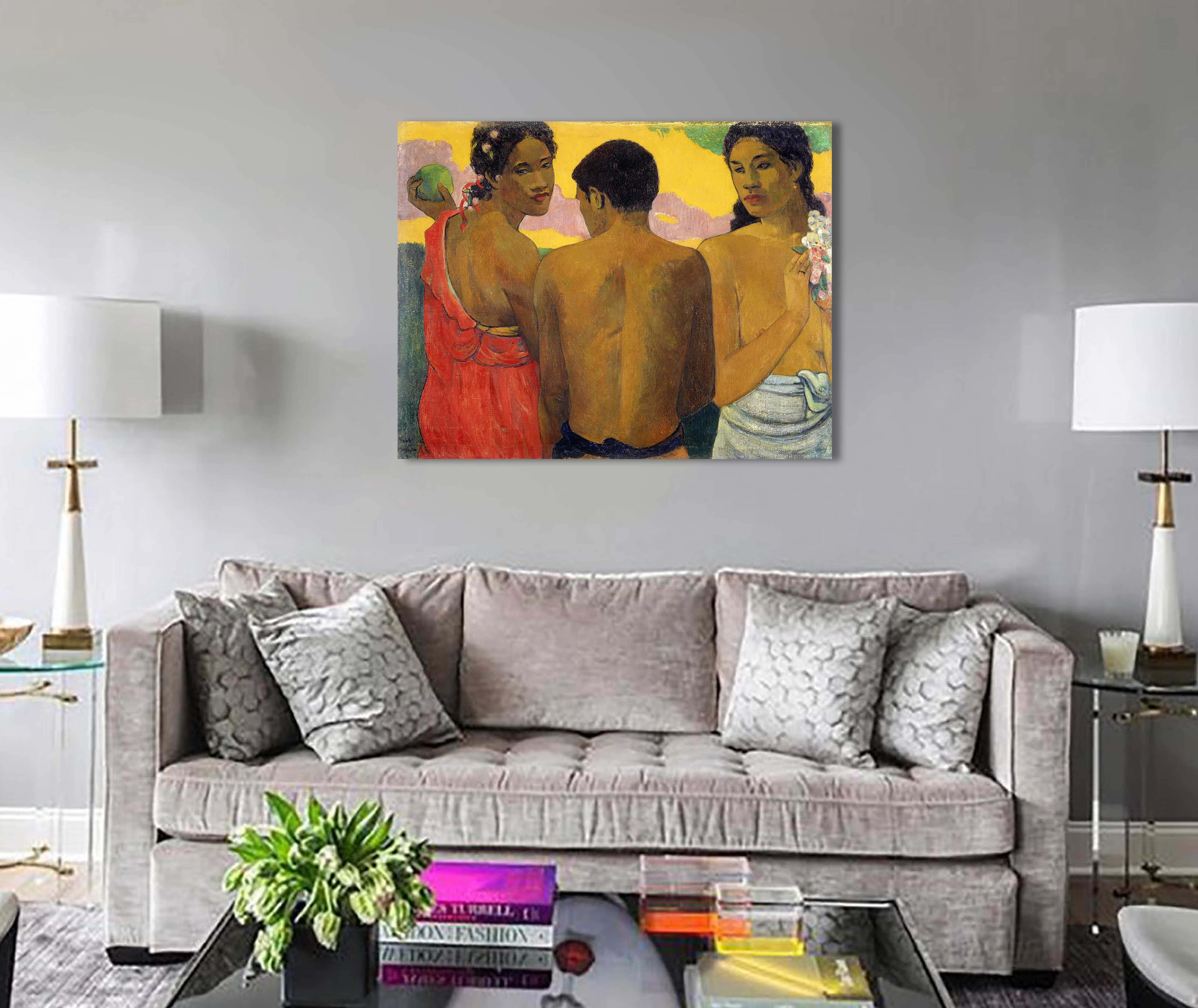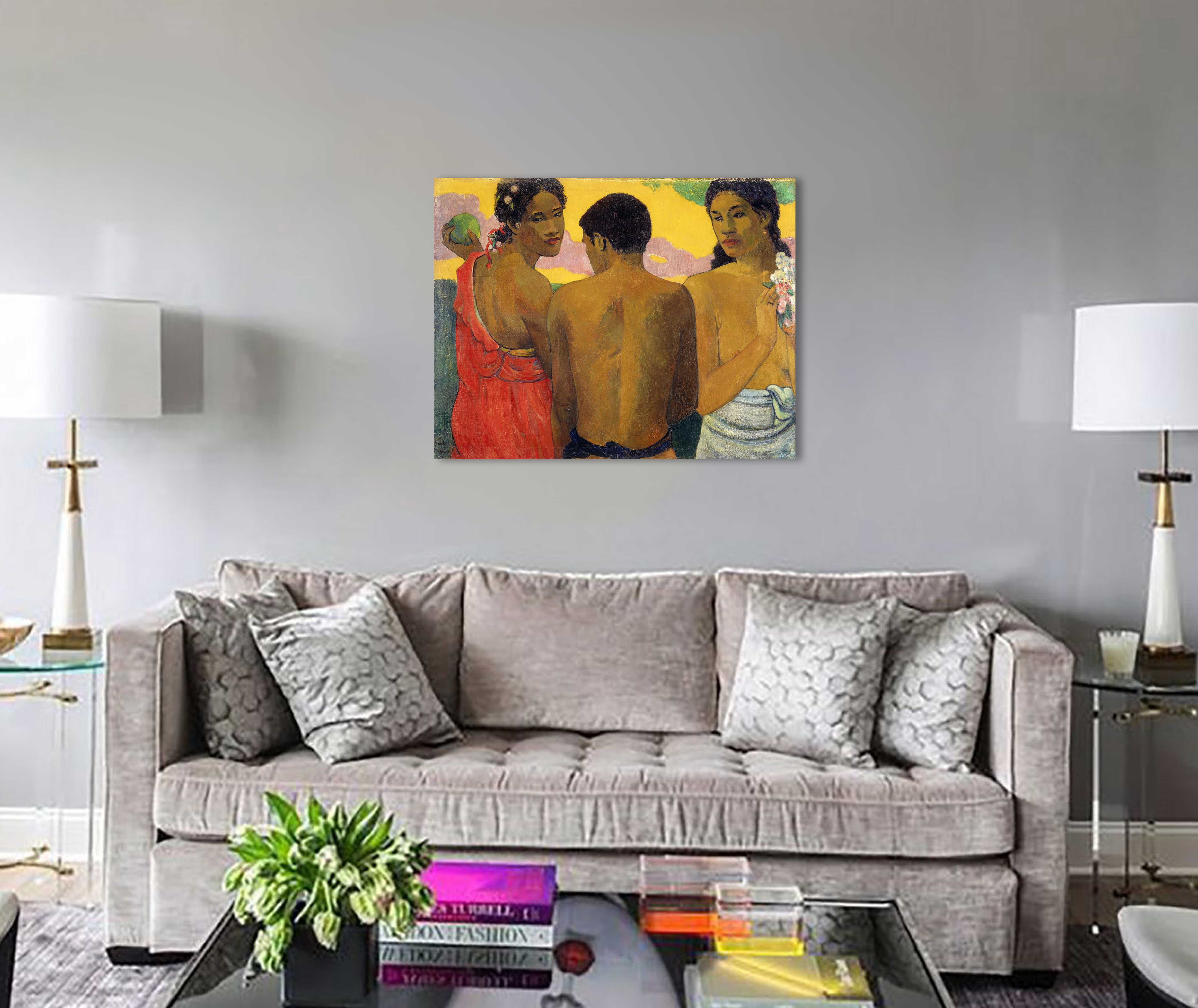 Мужчина посредине стоит практически спиной к зрителю. Мы видим только часть его лица. Но по его крепкой, стройной фигуре понятно, что он молодой. Справа и слева от него стоят девушки-таитянки. Они обе грустными влюблёнными глазами смотрят на молодого человека. Одна девушка держит в руке букет цветов, другая – тропический плод. Этот сюжет напоминает мифологическую сцену с яблоком раздора. Парню нравятся обе девушки, он выбирает.