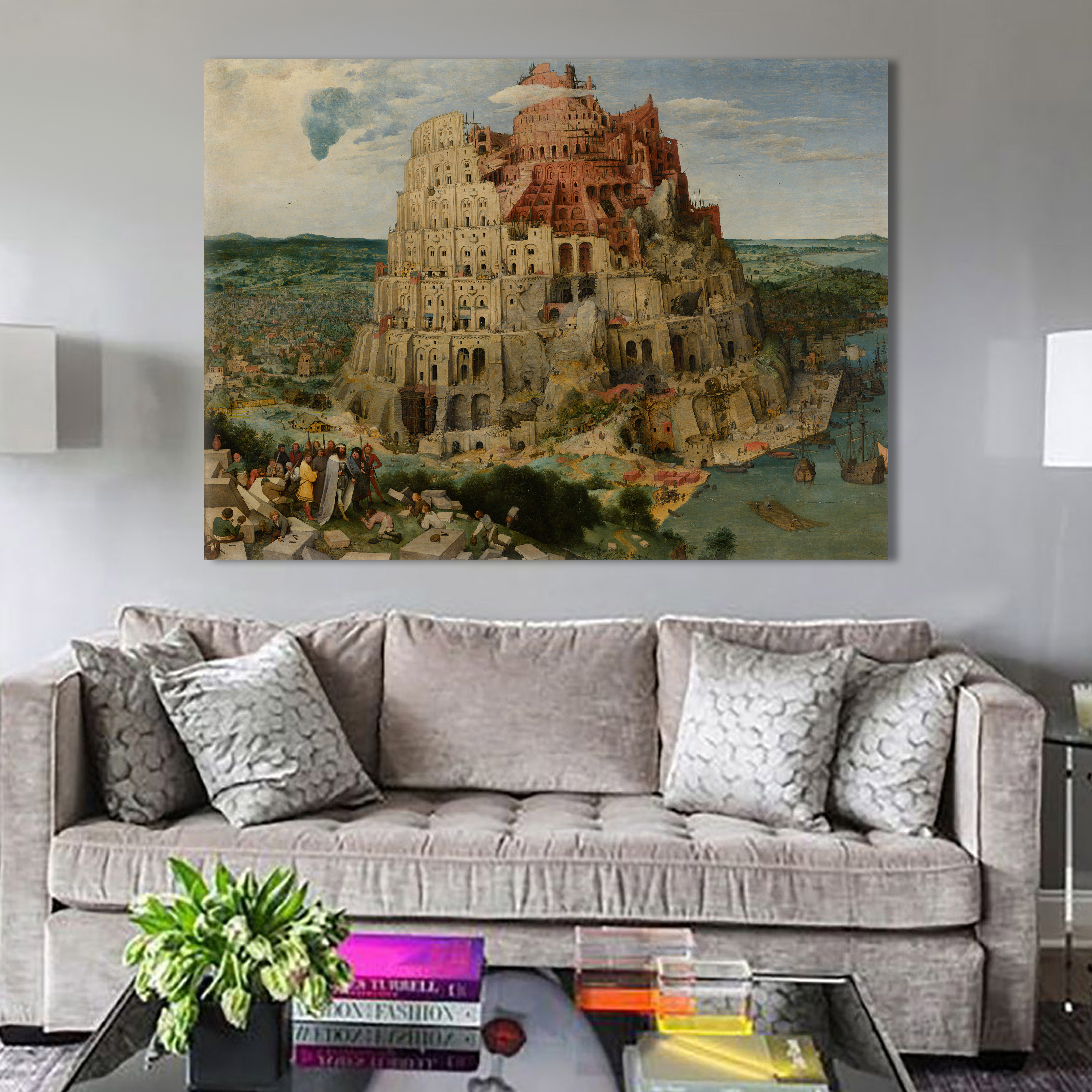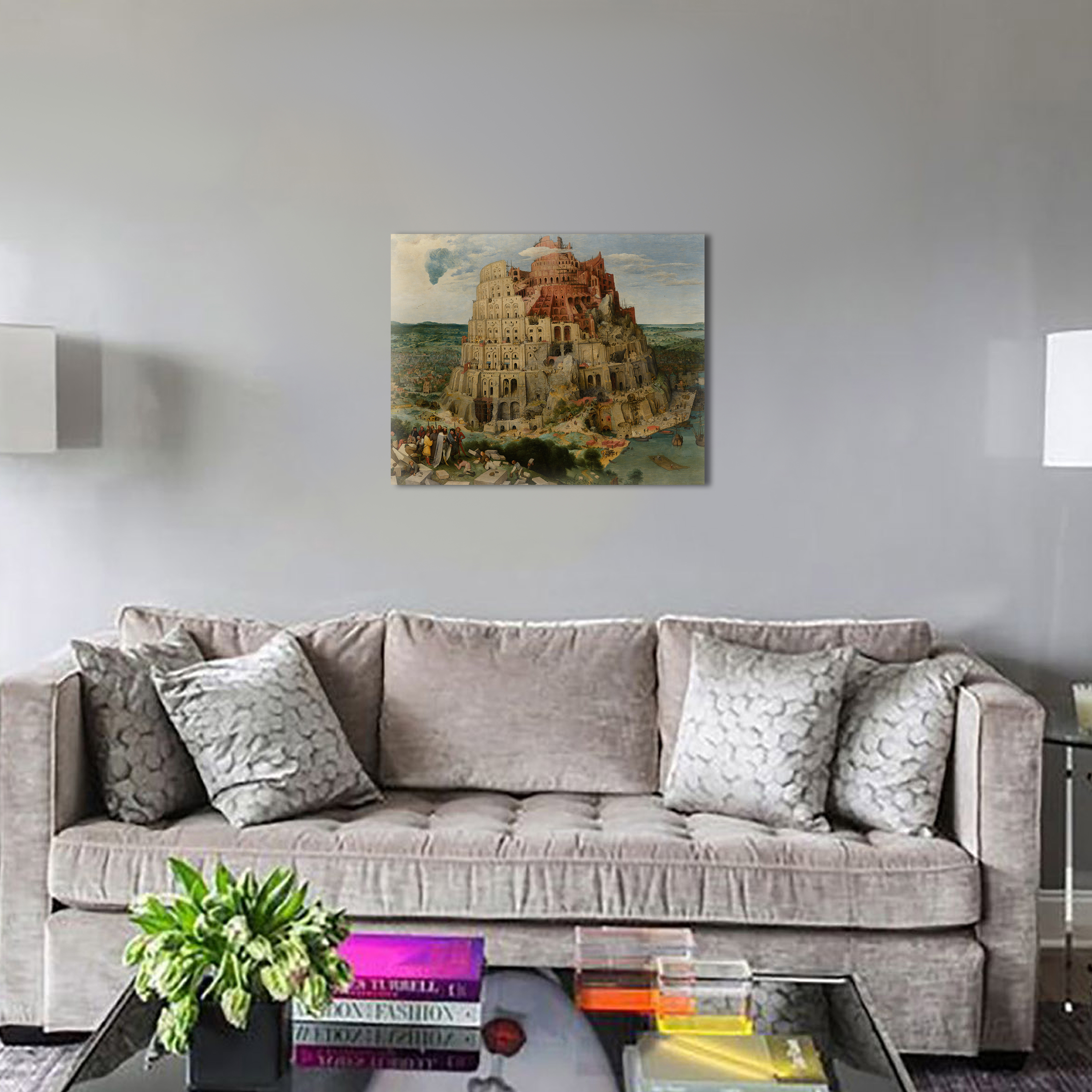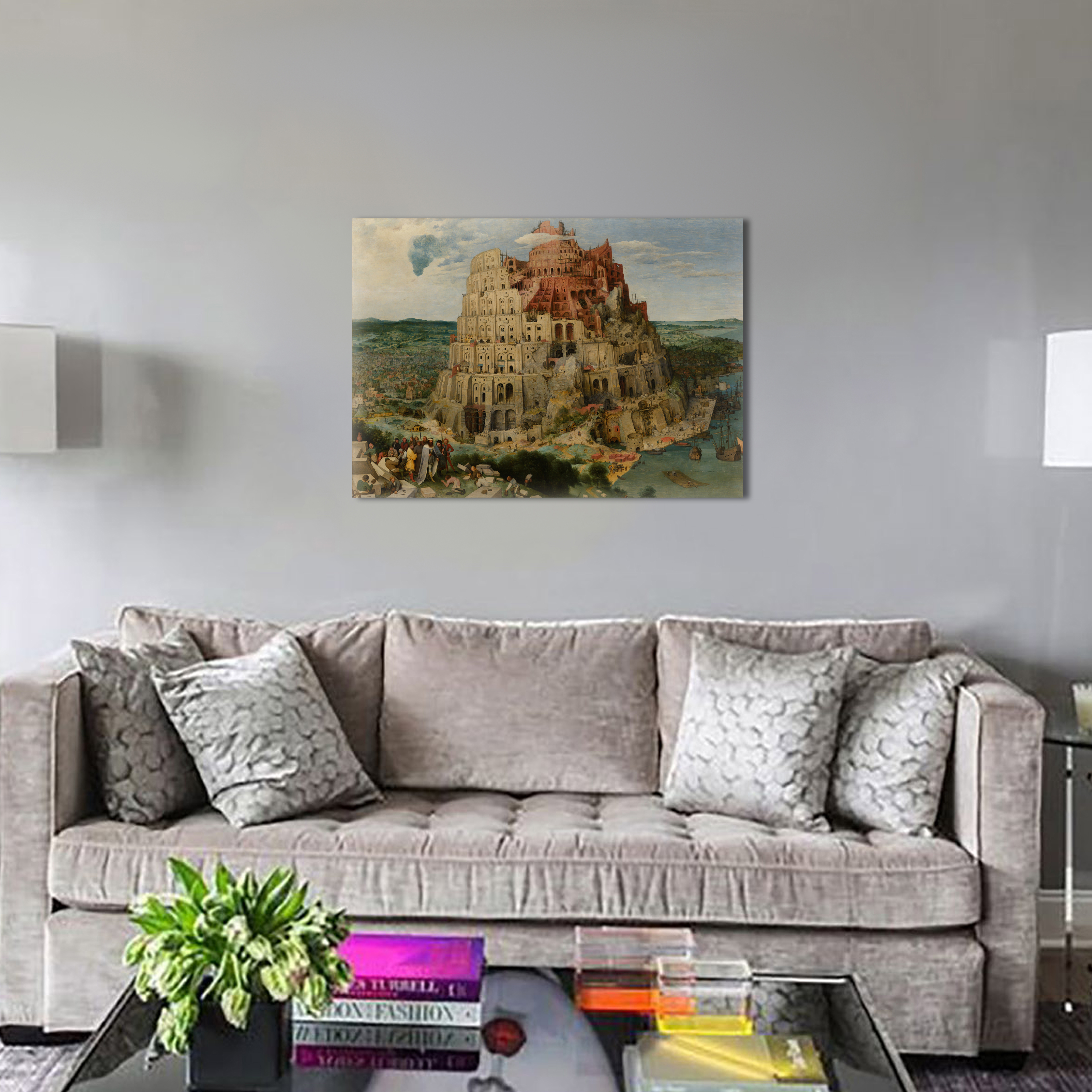 В основу картины положен сюжет из Первой книги Моисея о строительстве Вавилонской башни, которая была замыслена людьми, чтобы достичь своей вершиной неба. Известно, что в 1553 г. Брейгель побывал в Риме. В его «Вавилонской башне» легко узнаваем римский Колизей с его типичными чертами римской архитектуры: выступающими колоннами, горизонтальными ярусами и двойными арками.