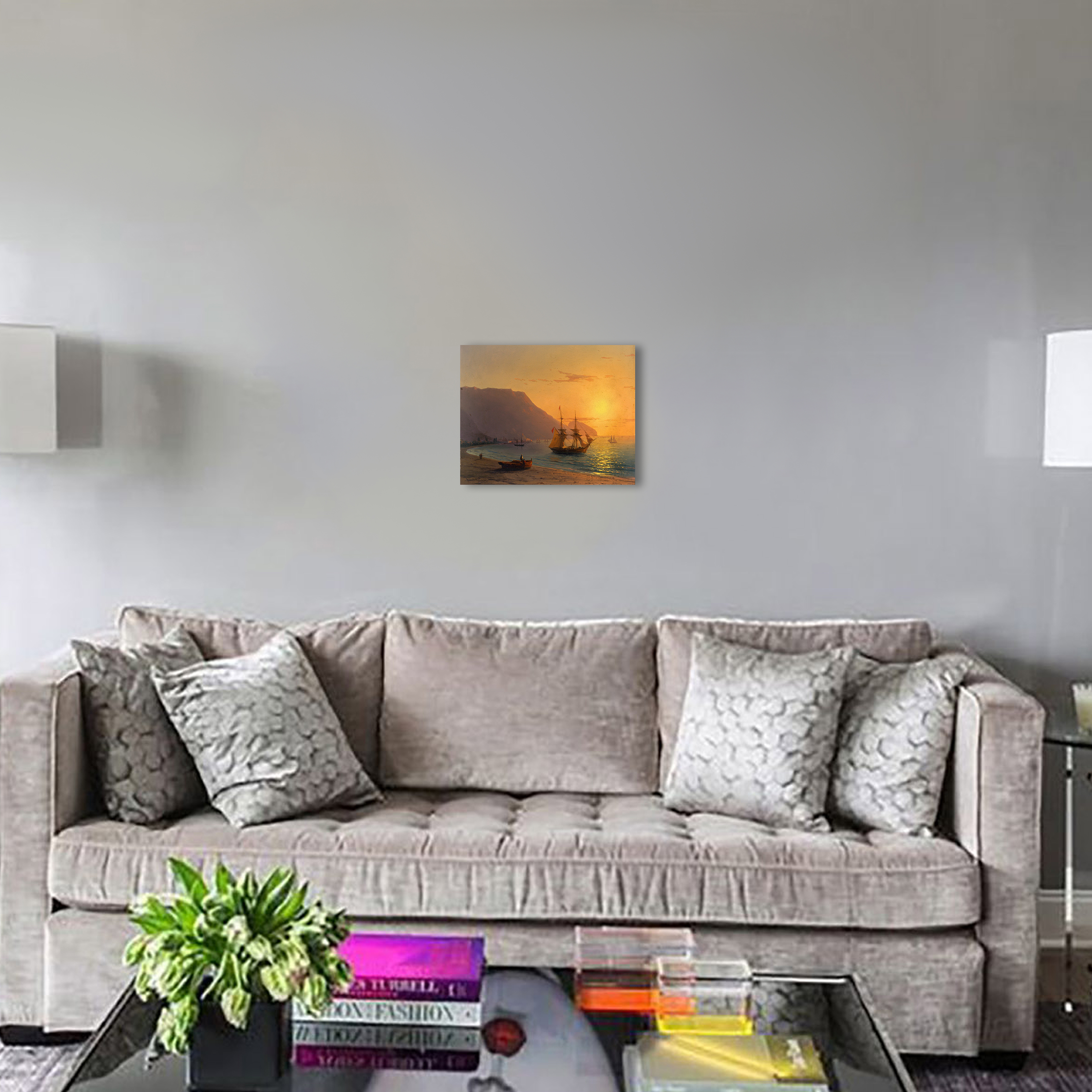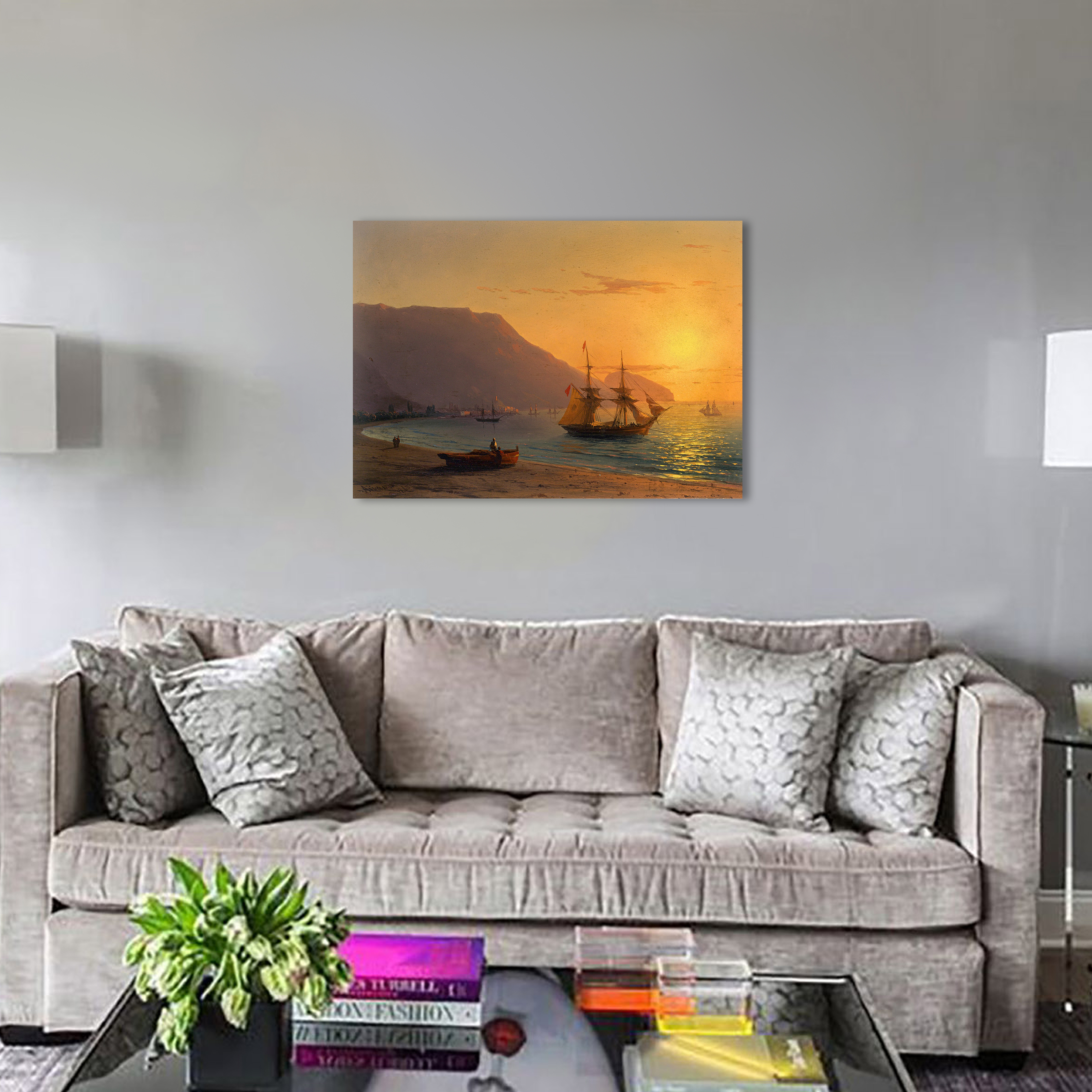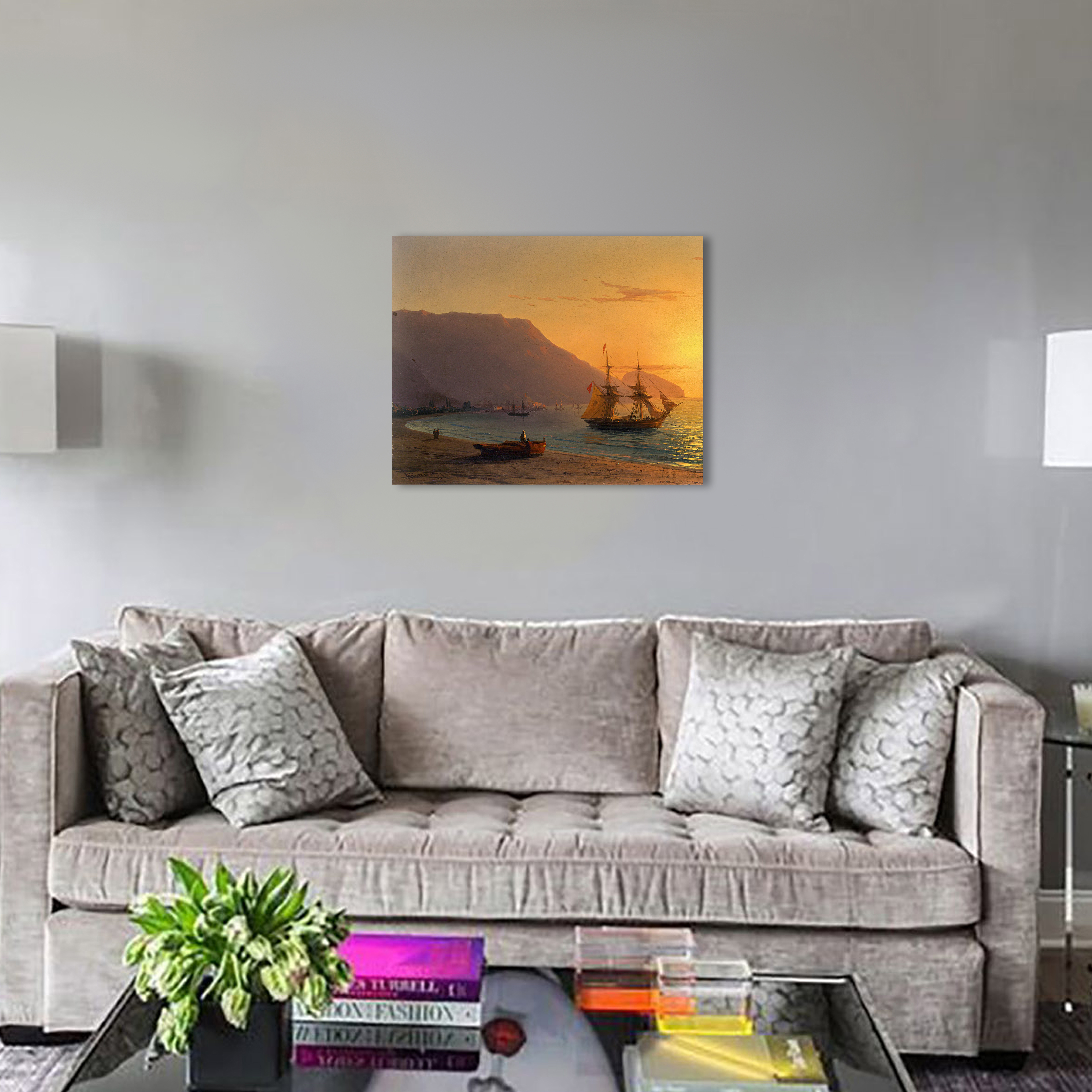 Спокойный безветренный вечер. Предзакатный час. Мягким золотом разливается по небесам солнечное сияние. В теплых лучах светила купаются небо и море. Айвазовский мастерски использует закон воздушной перспективы. От полотна веет тишиной и покоем.
